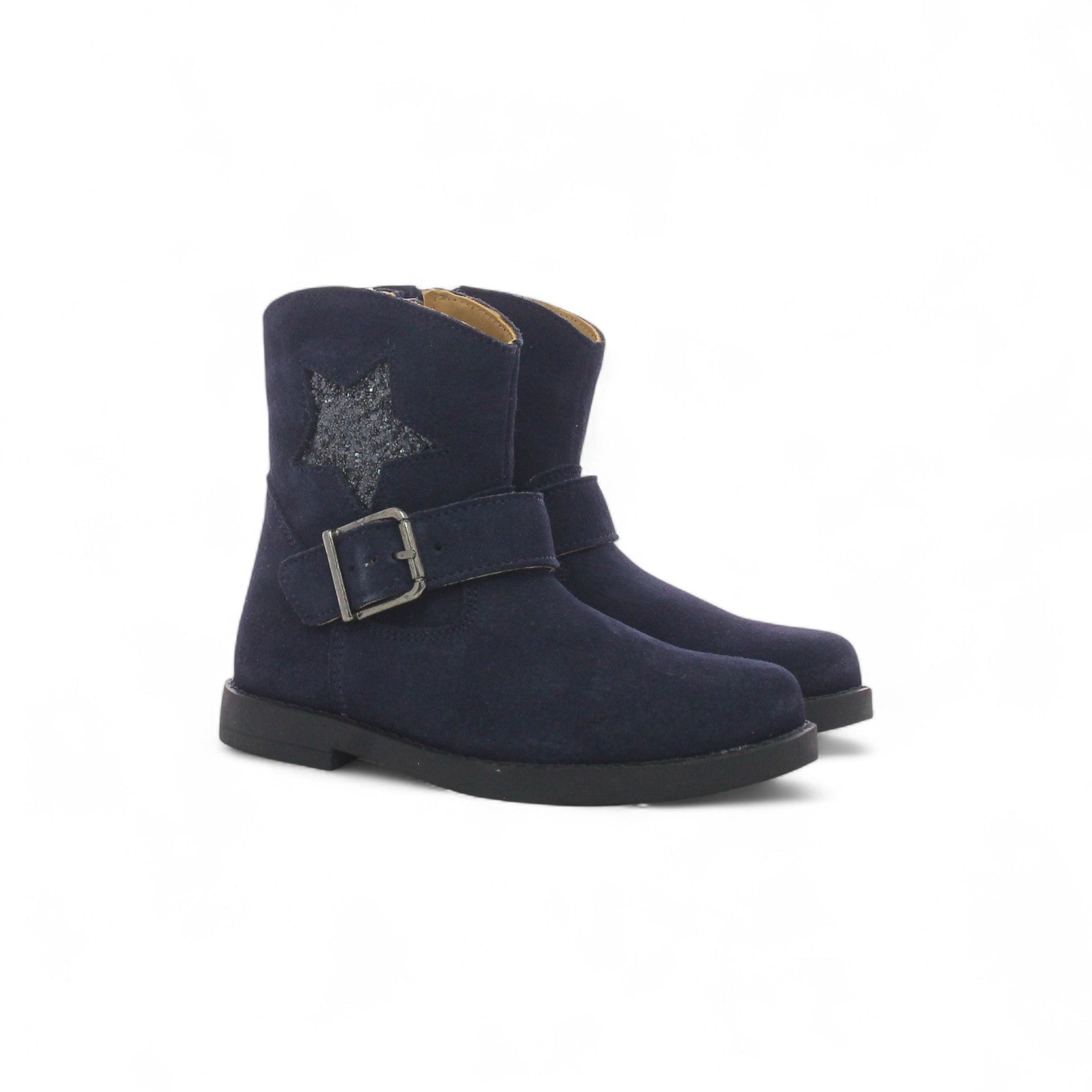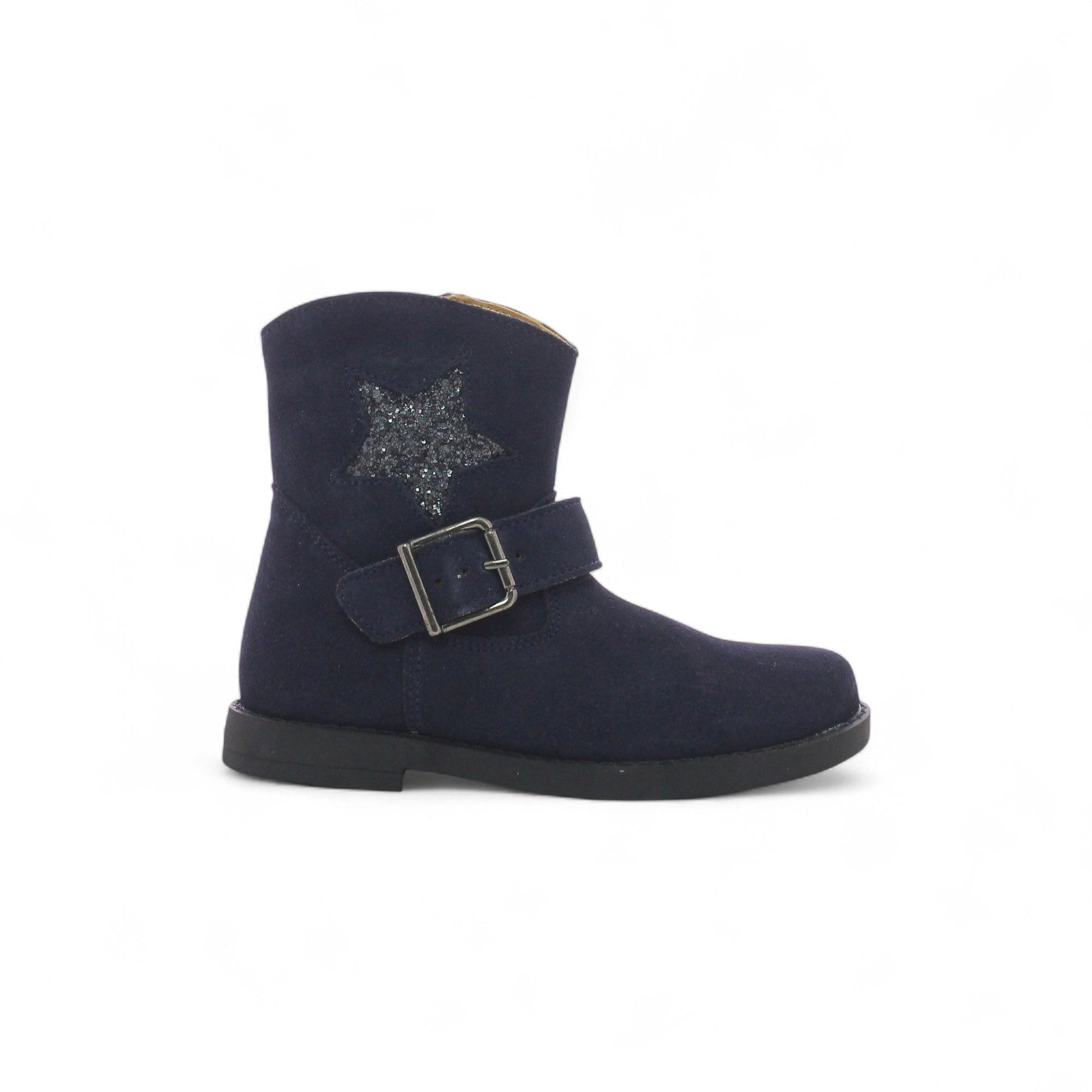Craquez pour cette bottine en cuir suédé bleu marine, idéale pour l’hiver. Son motif étoile glitter apporte une touche de brillance, tandis que la boucle décorative ajoute du style. Pratique avec sa fermeture zippée, elle allie confort, look et fantaisie !