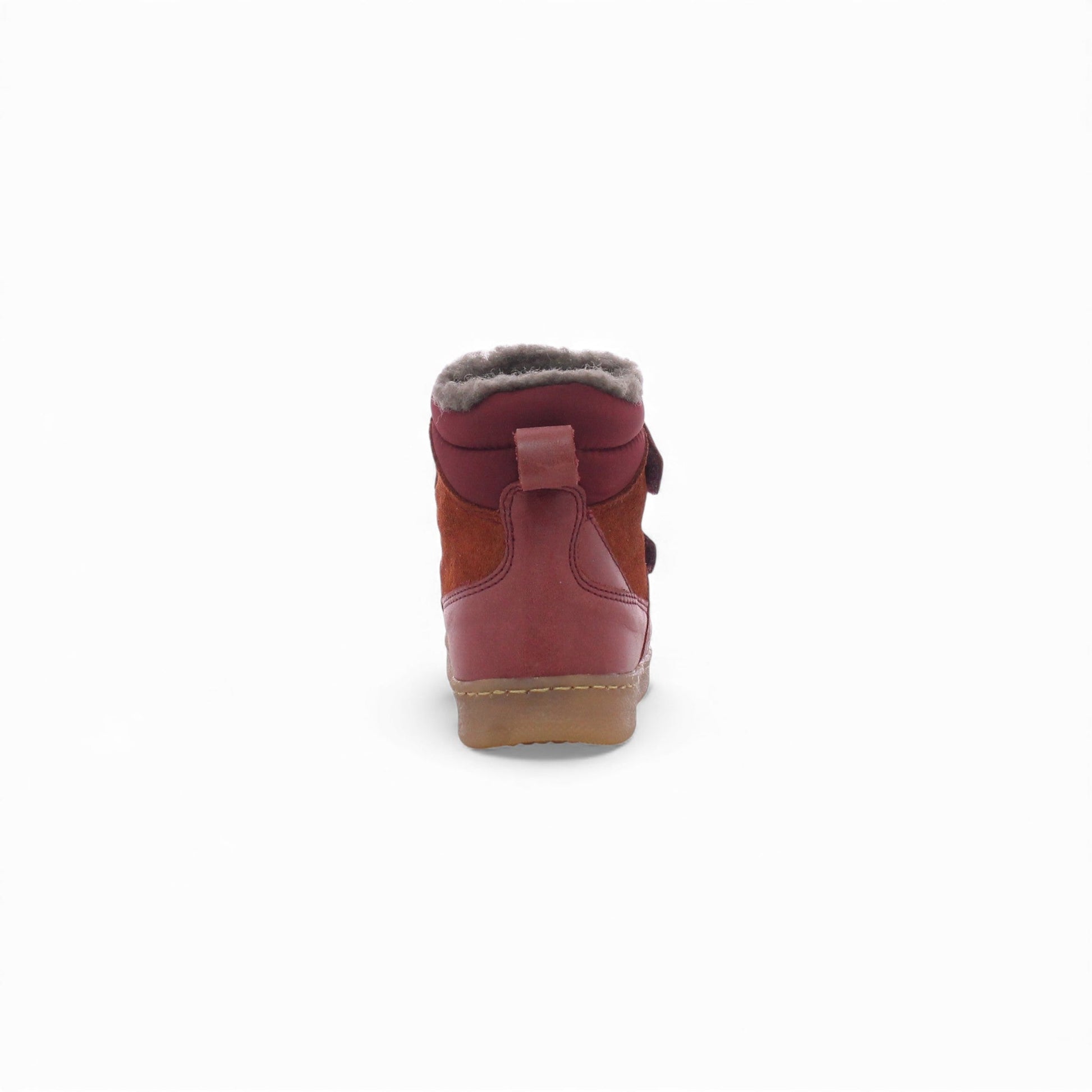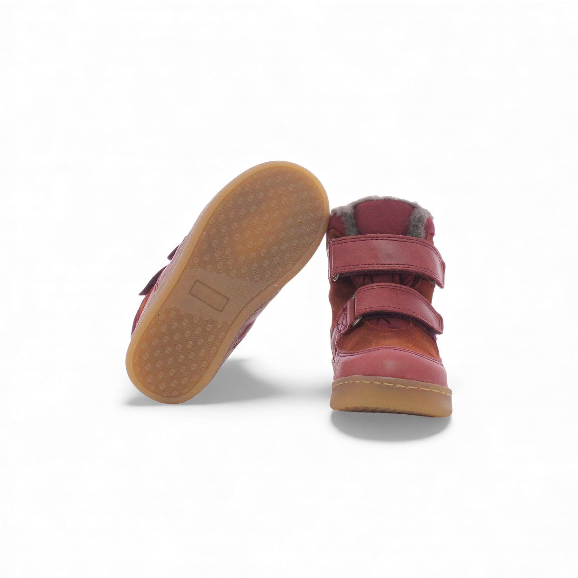 Avec sa belle couleur bordeaux et son mélange de cuir lisse et cuir suédé, elle offre un look à la fois moderne et chaleureux. Sa doublure fourrée garantit une chaleur optimale par temps froid, tandis que la semelle souple et antidérapante assure confort et stabilité. Les fermetures velcro permettent un enfilage rapide et facile, idéal pour les enfants. Un modèle pratique, confortable et stylé pour accompagner votre enfant au quotidien.