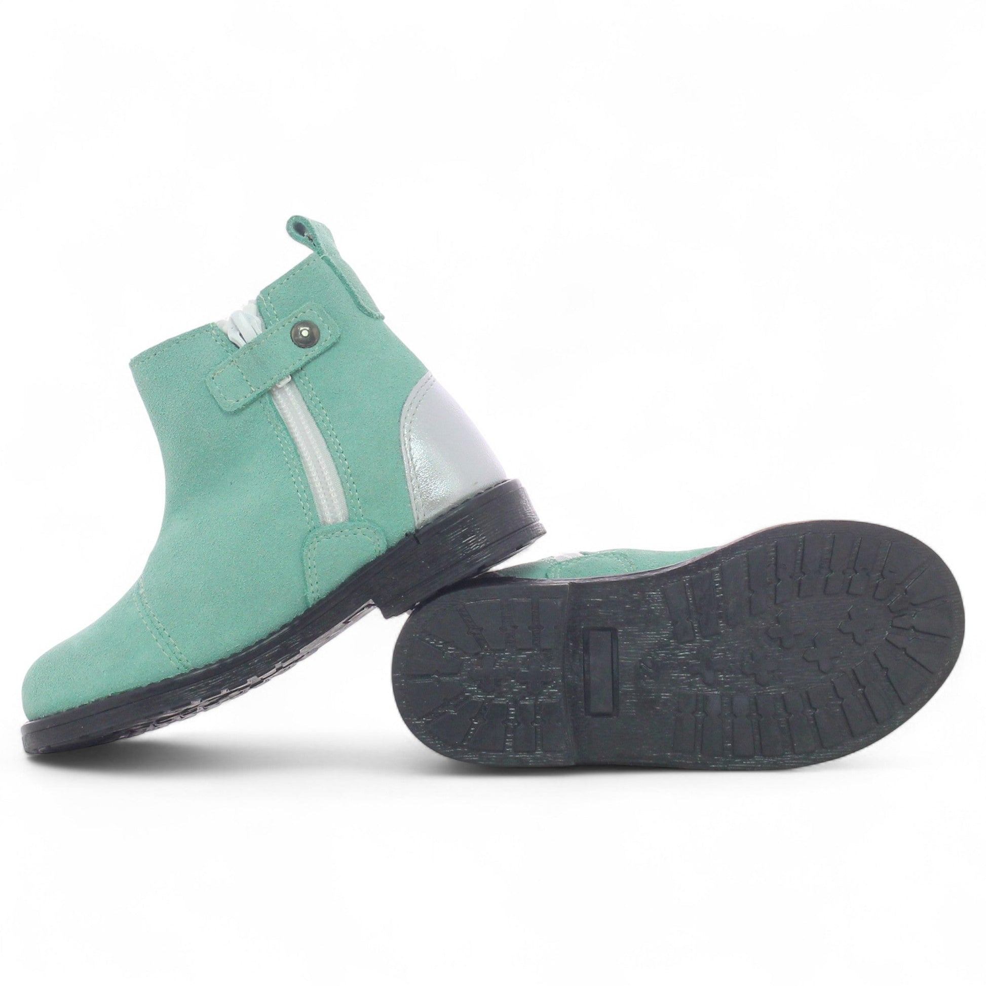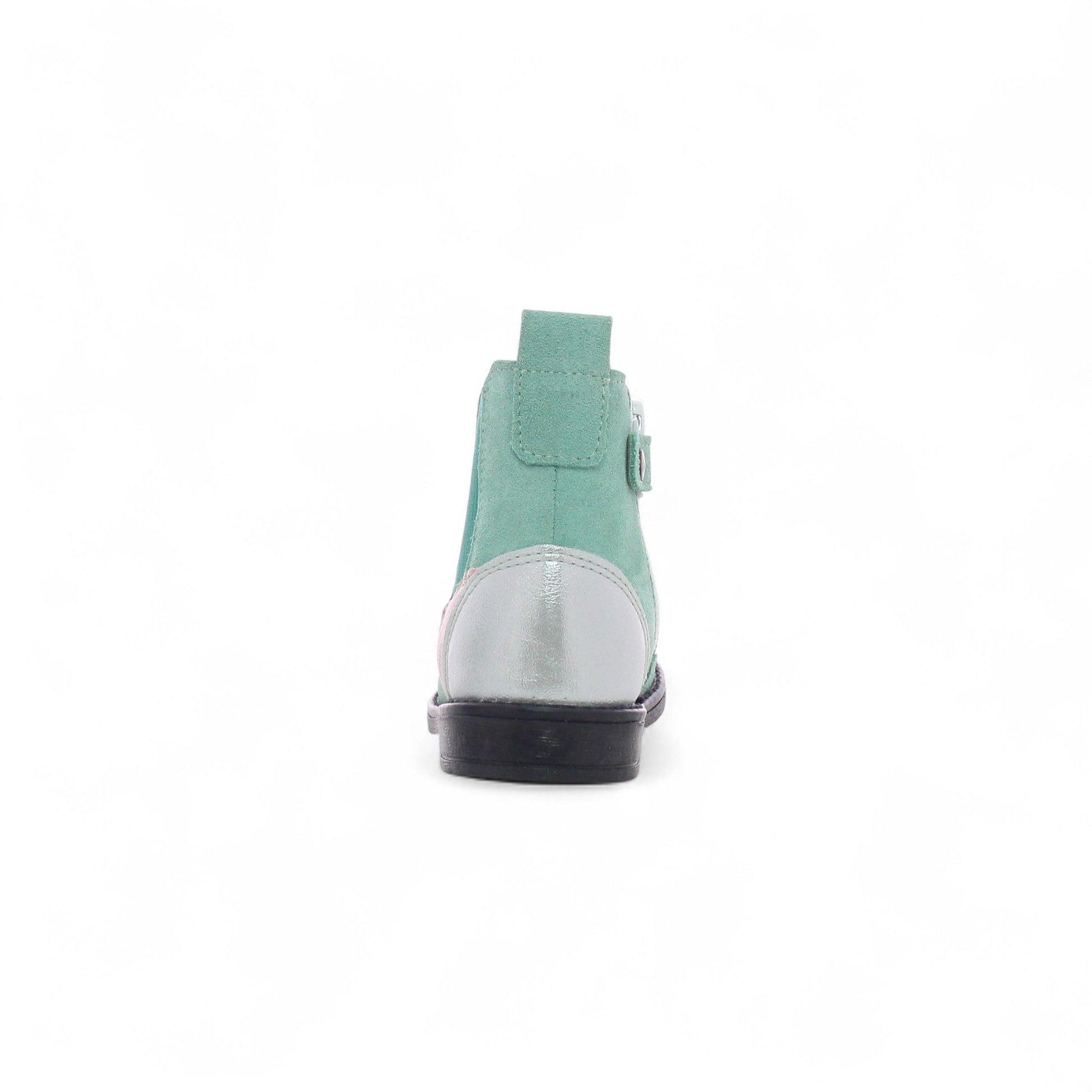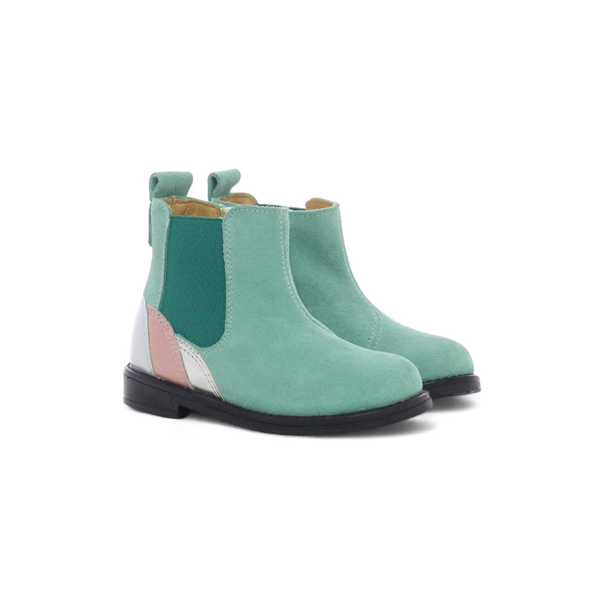 😻Alerte Mignonnerie! avec la bottine Chelsea en cuir daim, rehaussée d'un empiècement bicolore en cuir métallisé pour un look chic et festif. La fermeture éclair latérale et l'élastique assurent un enfilage facile et rapide, parfait pour les pieds des petites filles qui aiment les looks girly!